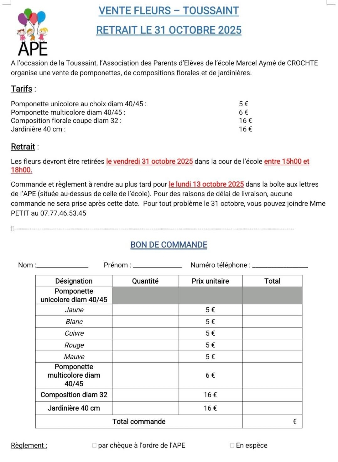 Le bon de commande et son règlement (chèque "APE de Crochte" ou espèce) doivent être déposés avant le 13 octobre 2025 dans la boîte aux lettres de l'APE (au dessus de celle de l'école).