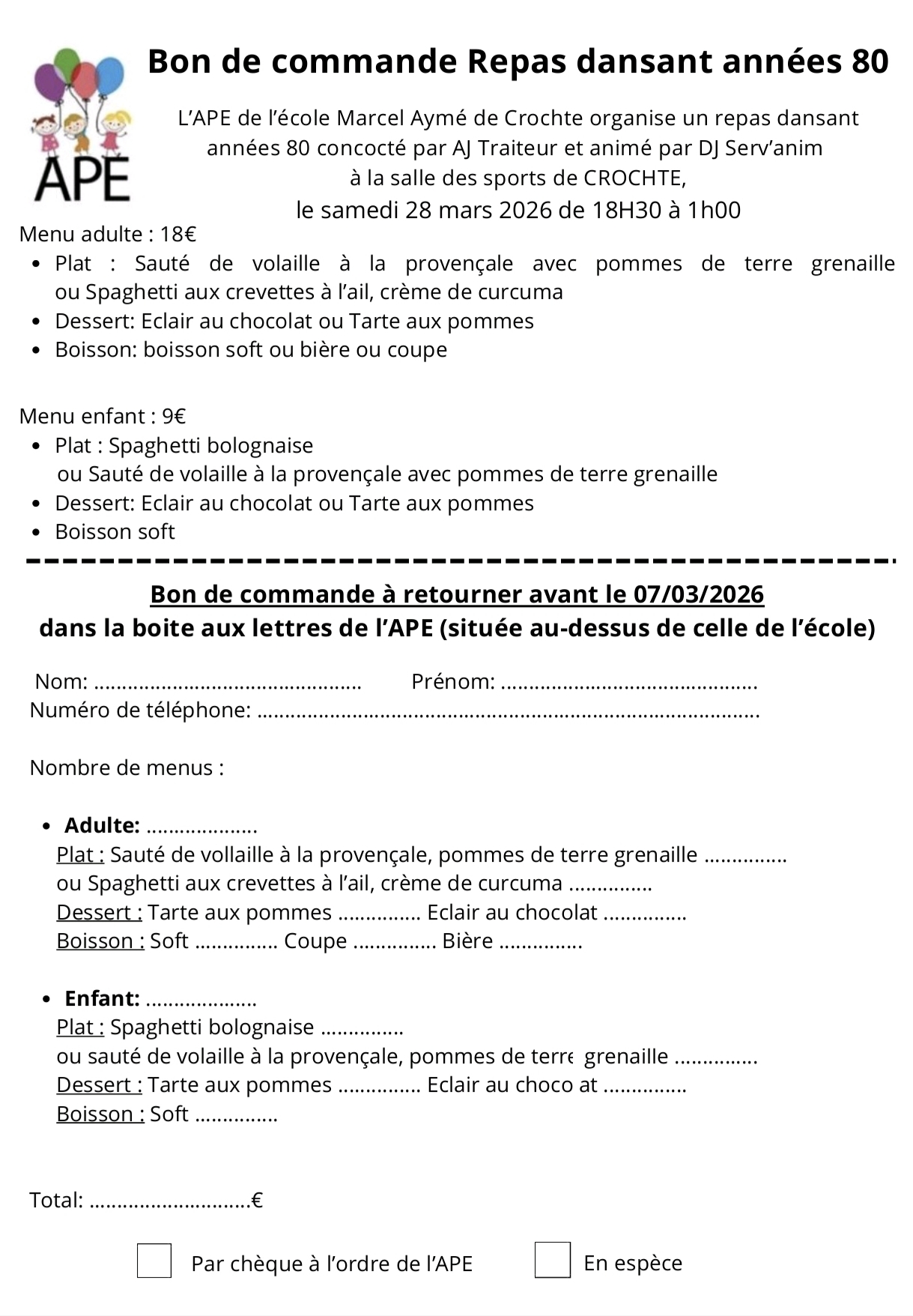 Réservation sur papier avec dépôt du paiement à mettre dans la boîte aux lettres de l'APE située devant l'école de Crochte avant le 07 Mars 2026